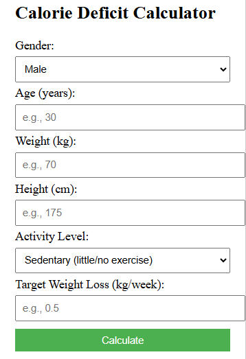 A Calorie Deficit Calculator helps users estimate how many calories they should consume each day to reach a specific weight-loss goal. By calculating your Total Daily Energy Expenditure (TDEE)—based on factors like age, weight, height, gender, and activity level—the tool subtracts a healthy deficit (e.g., 15–25%) to determine your daily calorie target for steady weight loss.