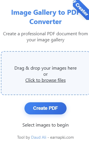 - Visit the Tool: Go to EarnApki Image Gallery to PDF Converter.