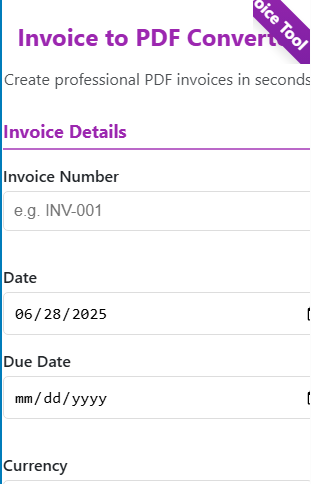 Need a quick and reliable way to turn invoices into PDF format? Our Invoice to PDF Converter is a 100% free online tool that instantly transforms your invoices into neat, professional, and printable PDFs.
