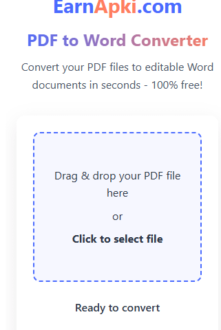 Our free PDF to Word converter by EarnApki.com allows you to easily transform your PDF documents into fully editable Microsoft Word (.docx) files. This browser-based tool preserves your original formatting while converting, making it perfect for contracts, reports, resumes, and other important documents.