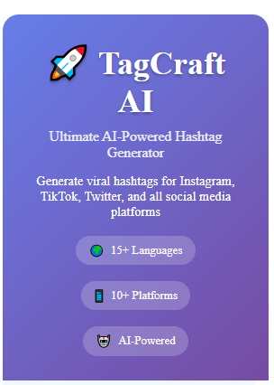 TagCraft AI is a powerful, AI-driven hashtag generator tool built for multi-platform social media optimization. It’s not just a tag suggester — it’s a complete hashtag research tool that analyzes keyword trends, platform-specific behaviors, and social media SEO signals. This allows it to suggest niche hashtags, trending hashtags, and high-converting tags customized for your audience and platform.